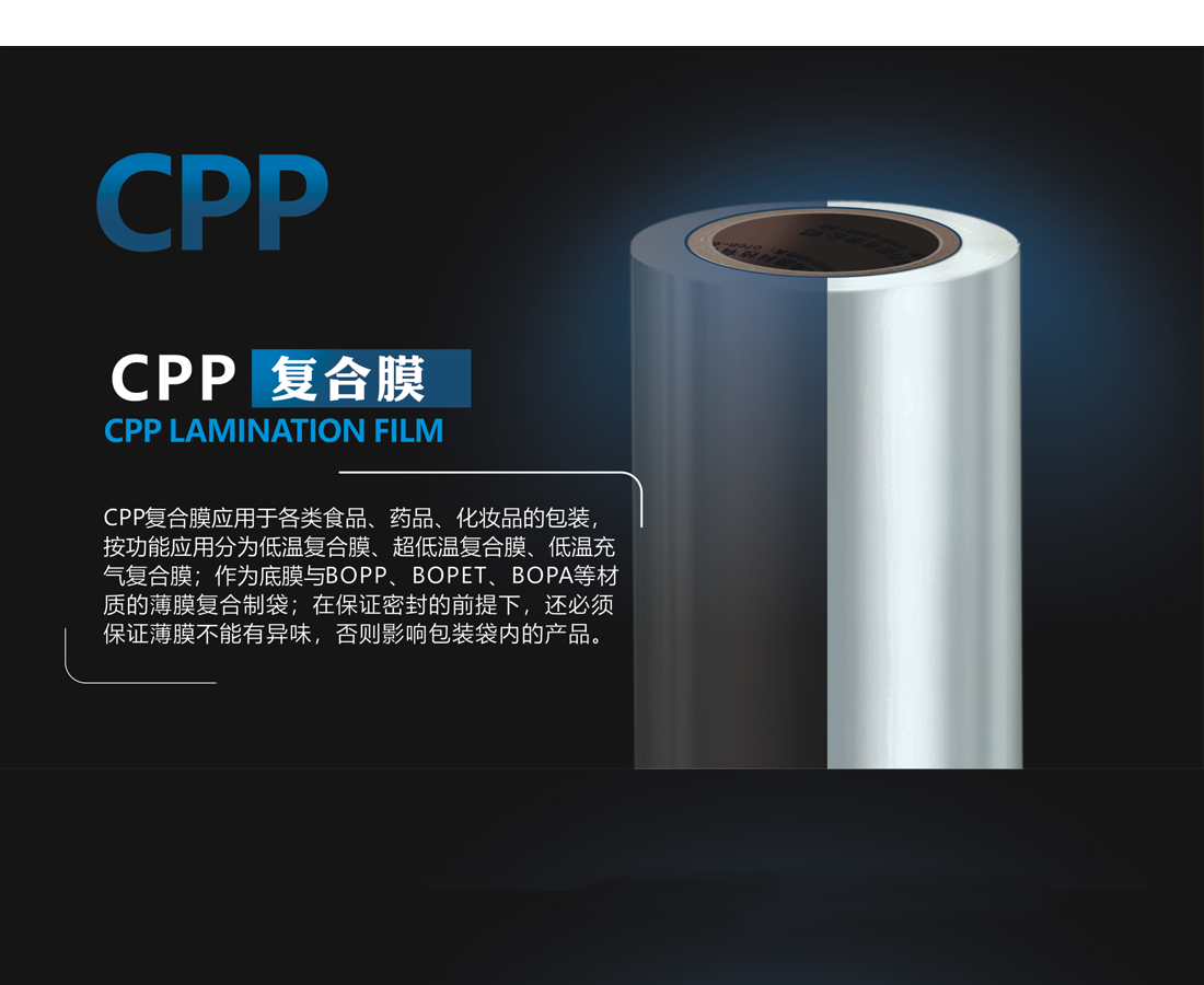 CPP复合膜应用于各类食品、药品、化妆品的包装,按功能应用分为低温复合膜、超低温复合膜、低温充气复合膜;作为底膜与BOPP、BOPET、BOPA等材质的薄膜复合制袋;在保证密封的前提下,还必须保证薄膜不能有异味,否则影响包装袋内的产品。